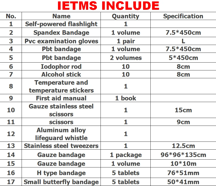 It's important to note that the specific contents of such a kit may vary depending on the manufacturer and brand. Therefore, when considering a kit like this, it's essential to review the included items and assess whether they meet your specific needs and activities. Additionally, regular inspection and replenishment of the kit's contents are crucial to ensure its readiness for emergencies.