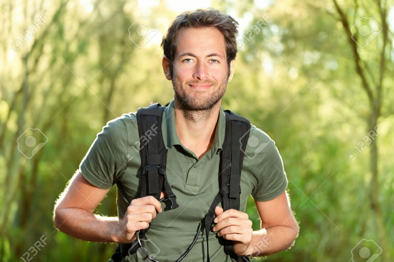 Young Man Hiking Smiling Happy Portrait Male Hiker Walking In