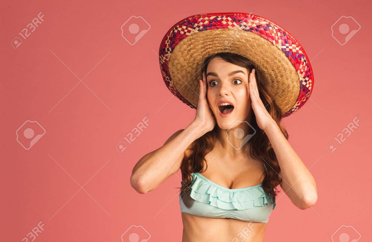 Young Ecstatic Surprised Woman On Tropical Vacation In Beach Stock